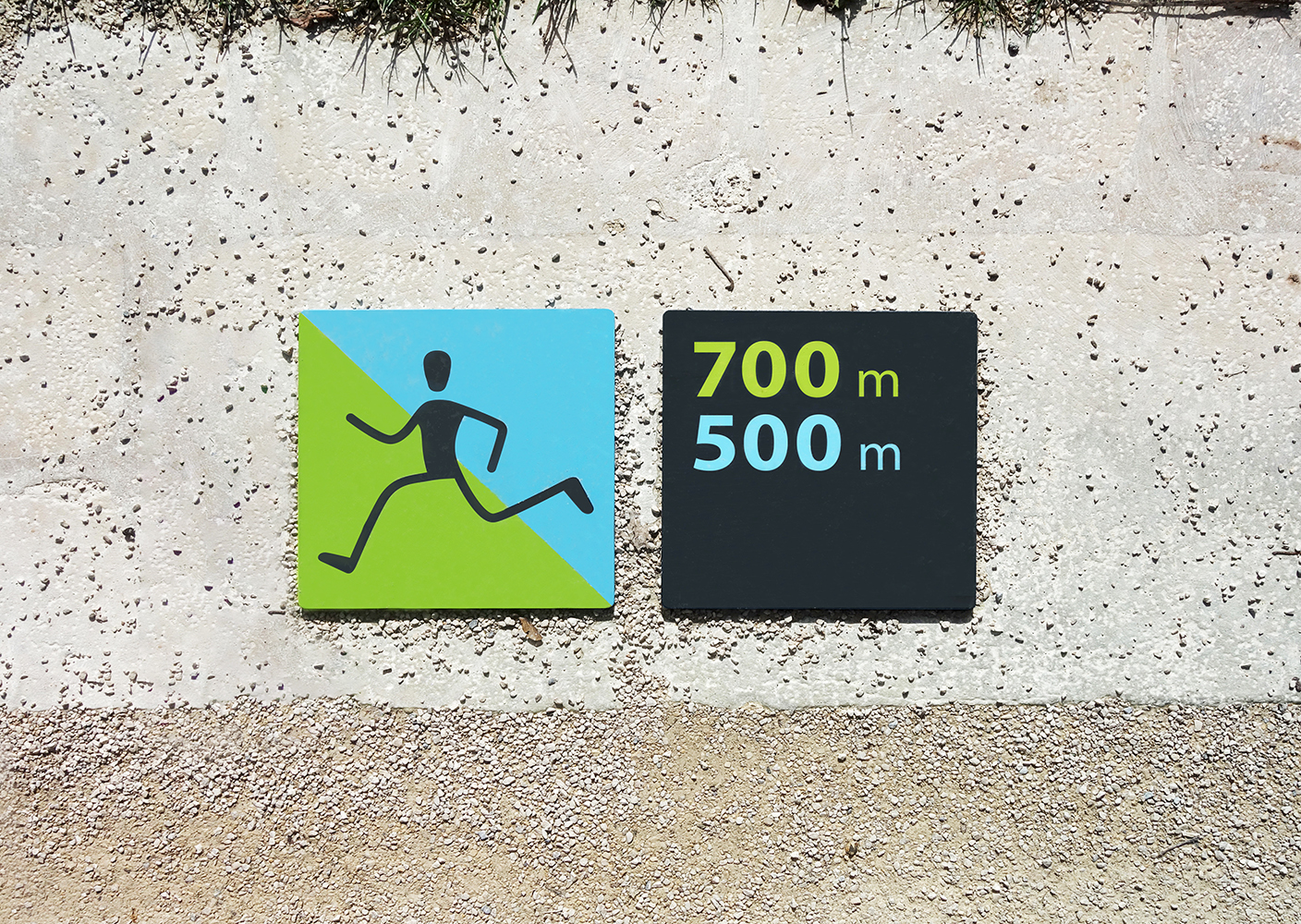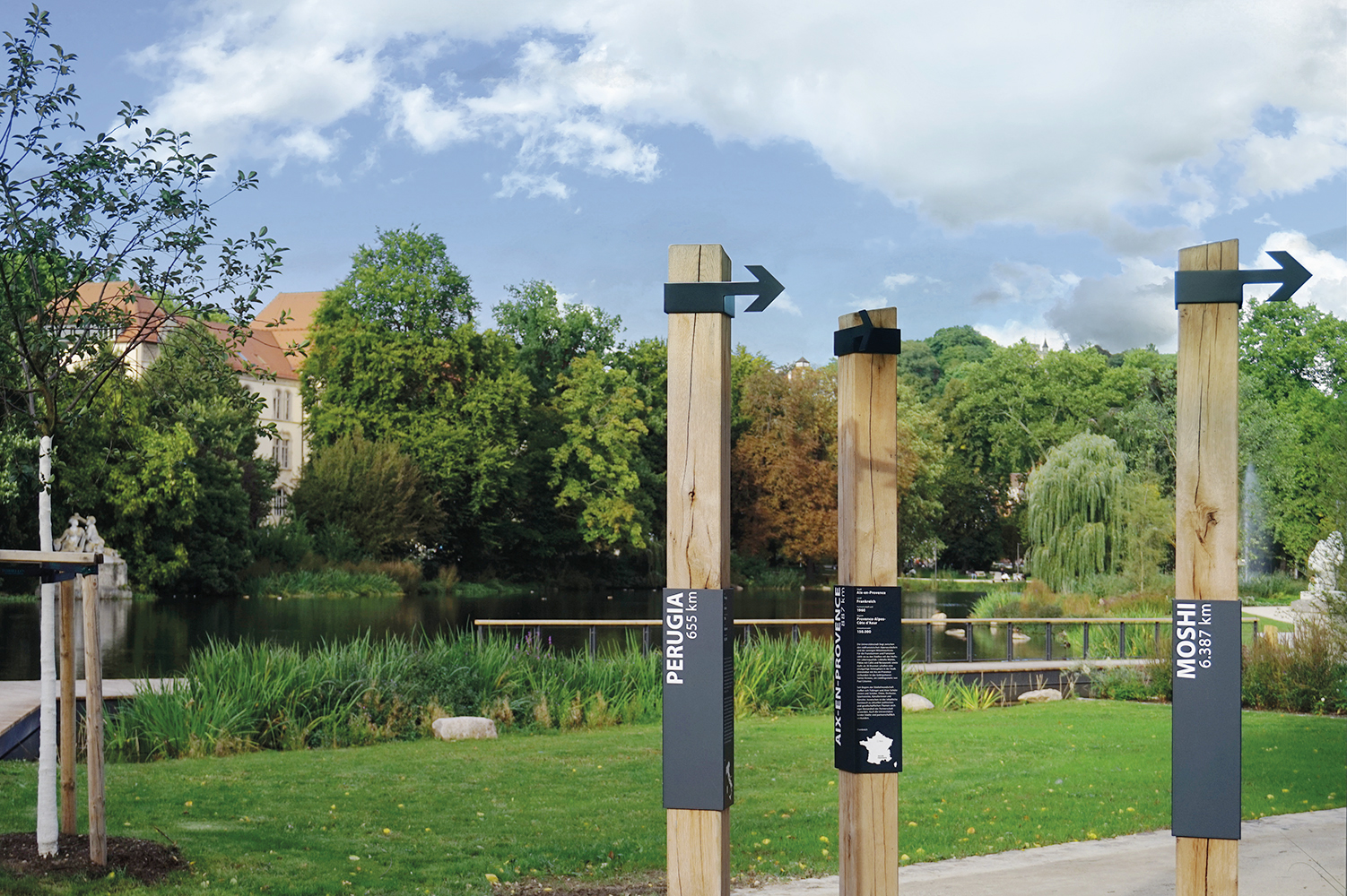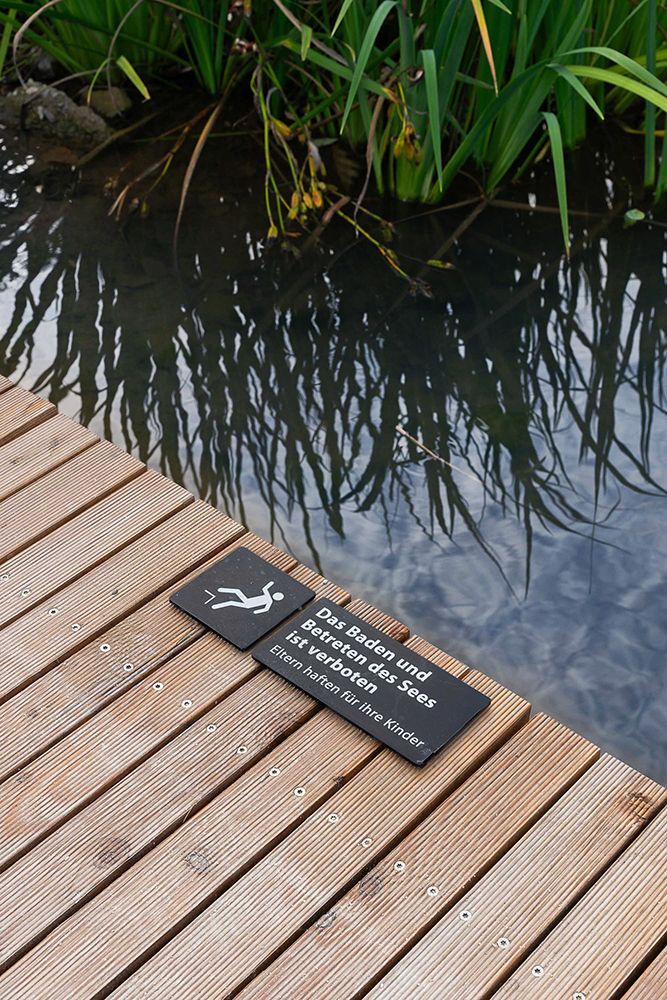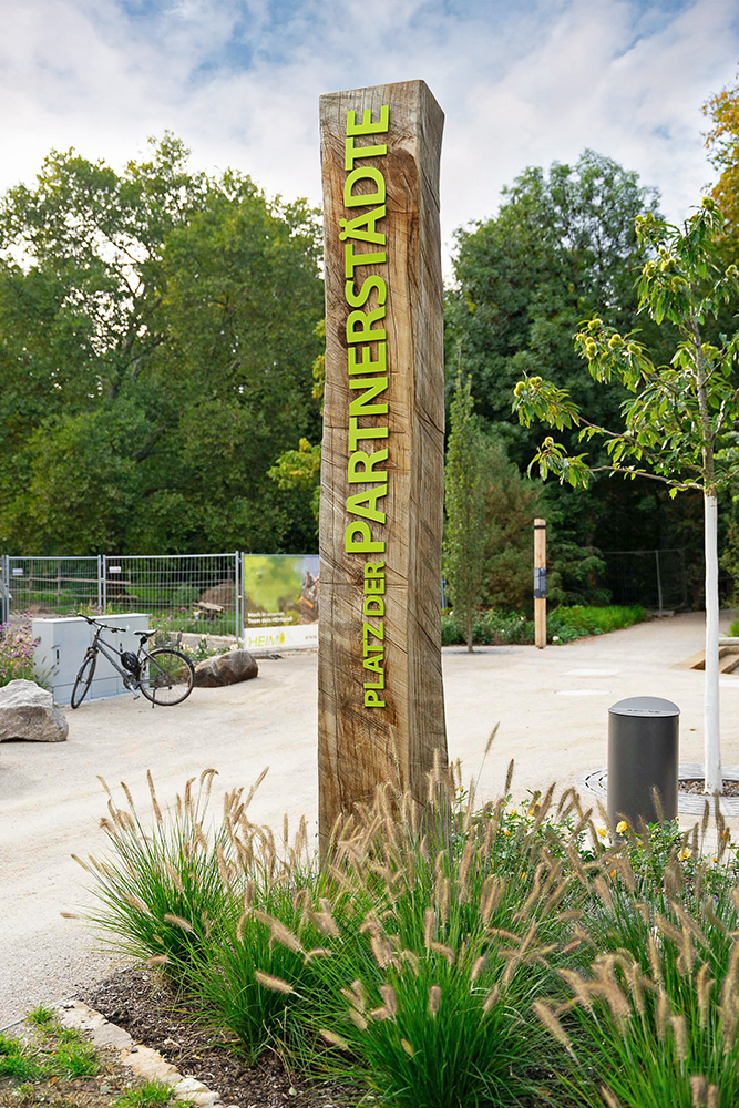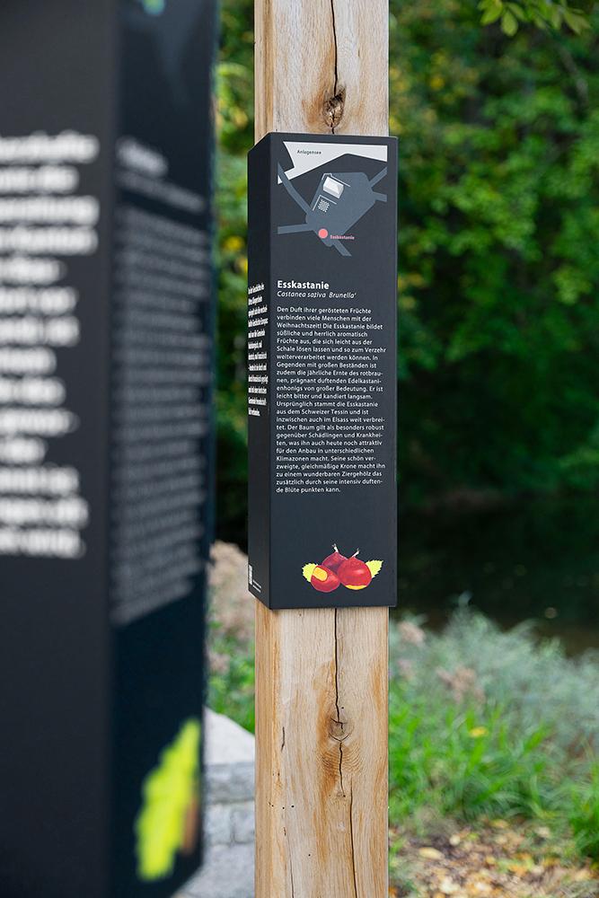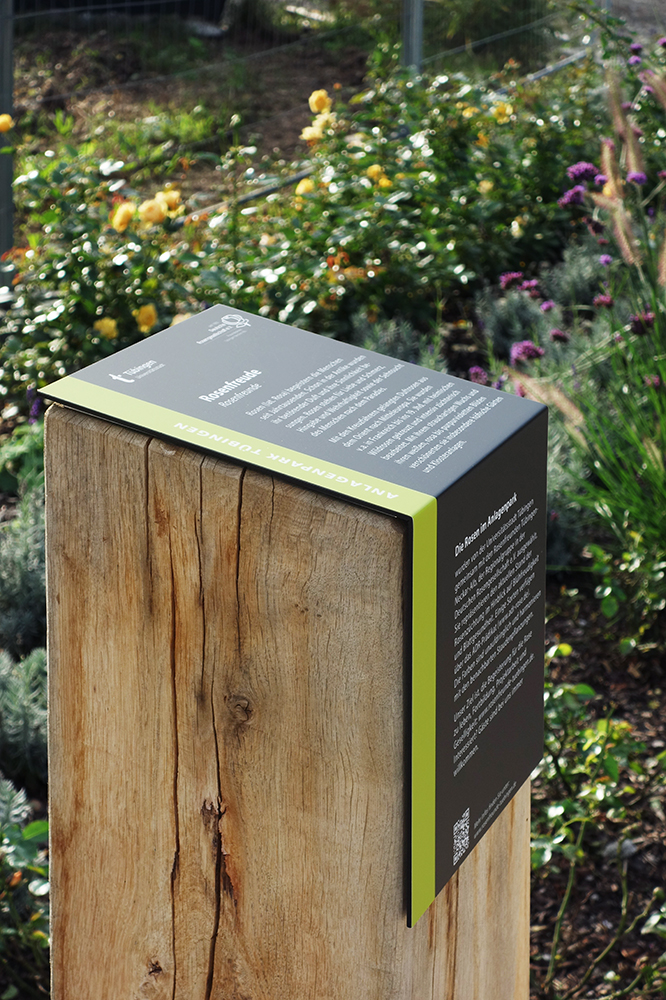 Innerhalb des Parks dienen Holzelemente als Grafikträger und fügen sich harmonisch in die landschaftliche Gestaltung ein. Das durchgängige Farbkonzept aus Anthrazitgrau und Hellgrün sorgt für eine klare Wiedererkennbarkeit.