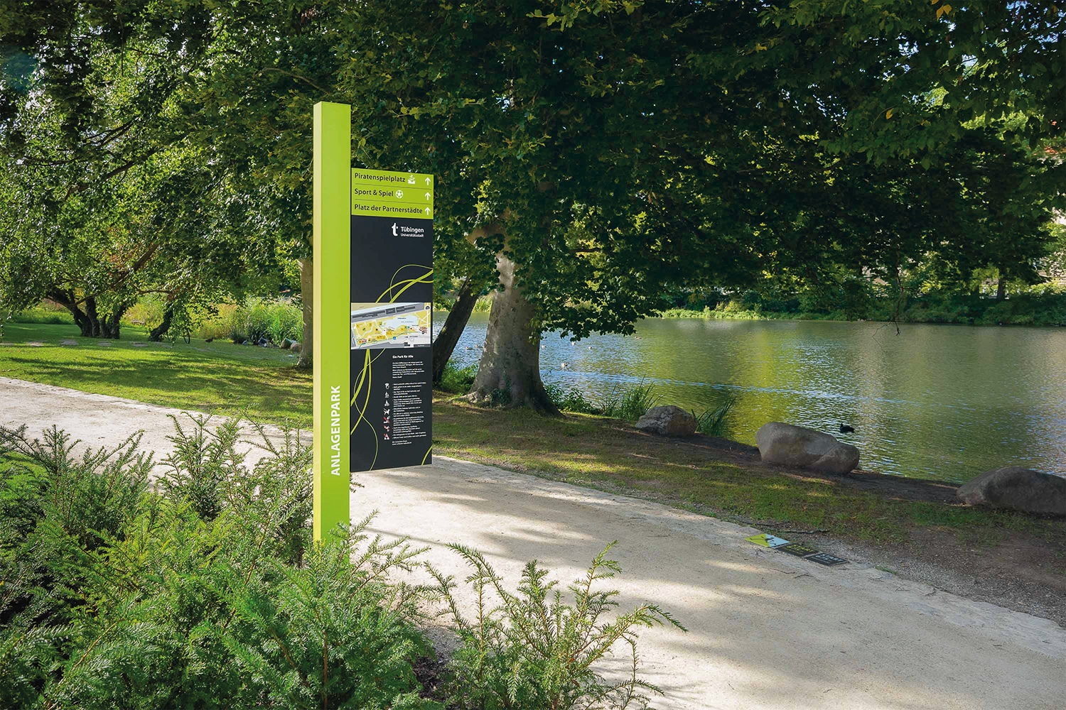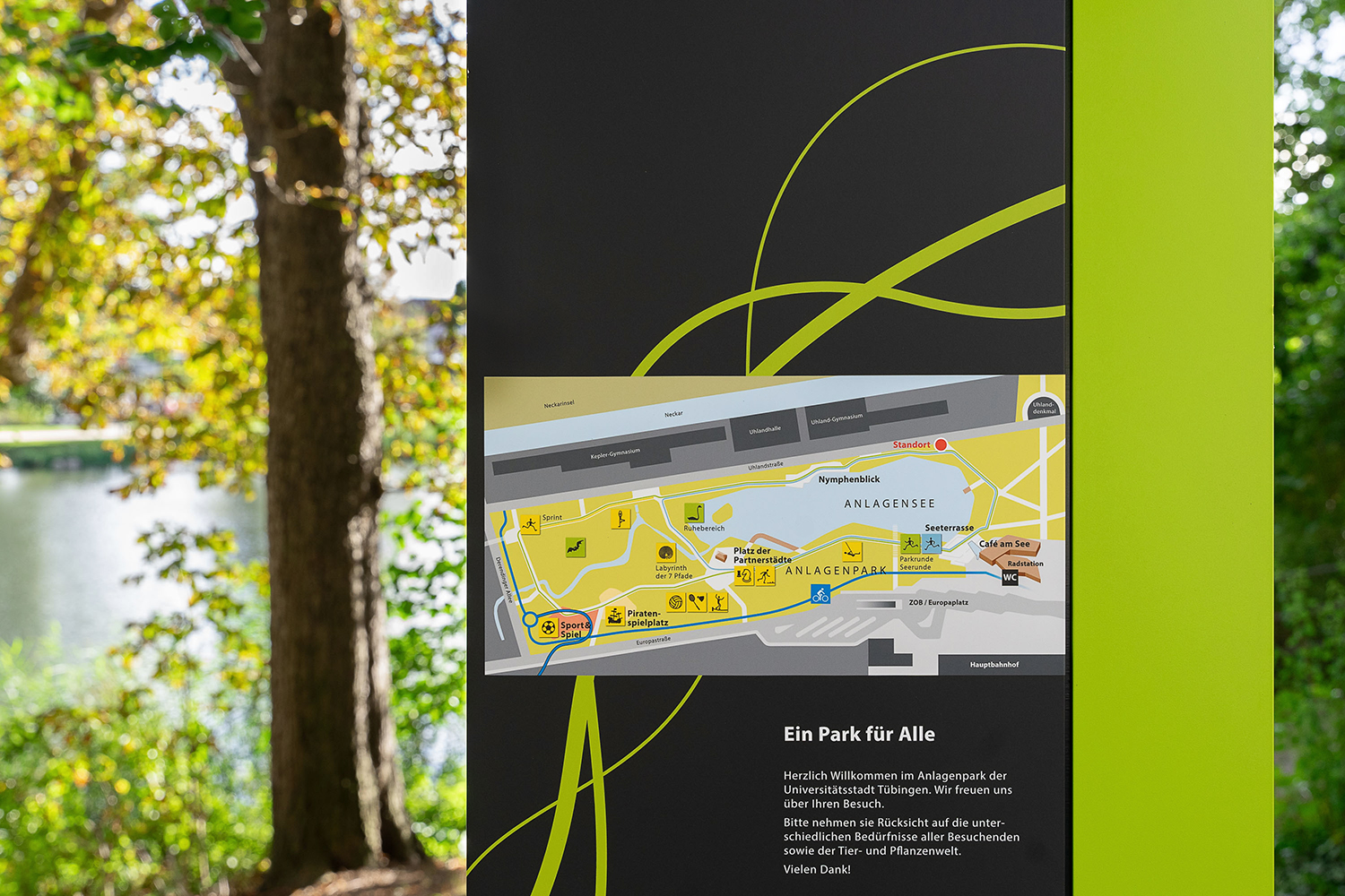 Die Signaletik des neu gestalteten Anlagenparks umfasst Parkeingangsstelen, verschiedene Informationselemente, Zielkennzeichnungen sowie Sporthinweise. Der hellgrüne vertikale Leitstreifen der Parkeingangsstelen greift die Gestaltung der städtischen Tübinger Leitsysteme auf und markiert den Park im Stadtraum. Auf den Stelen sind die wichtigsten Ziele groß und schnell erfassbar dargestellt, während der Übersichtsplan zusätzliche Informationen vermittelt.