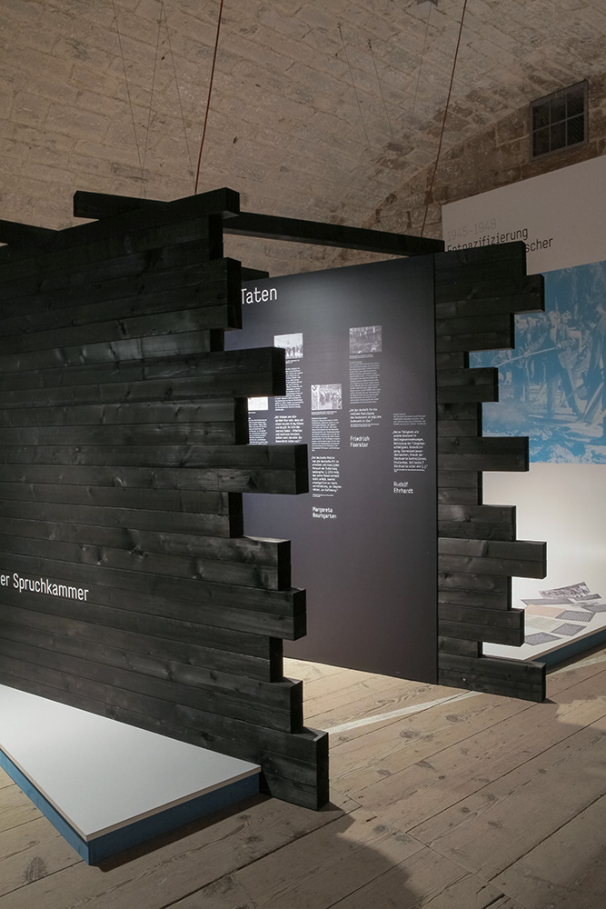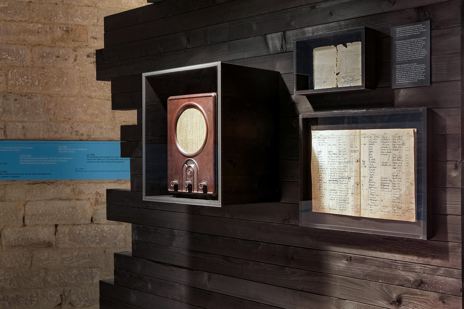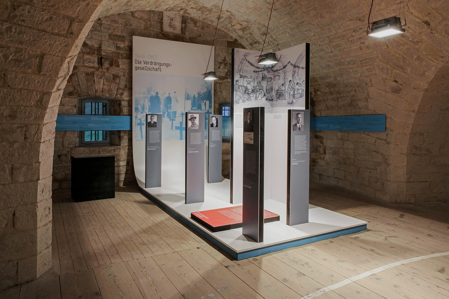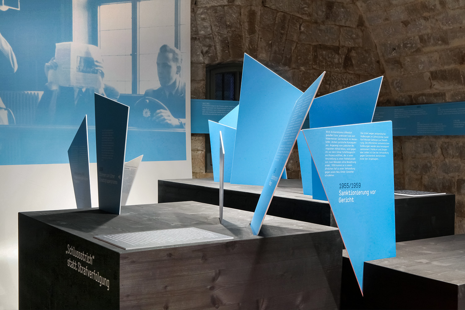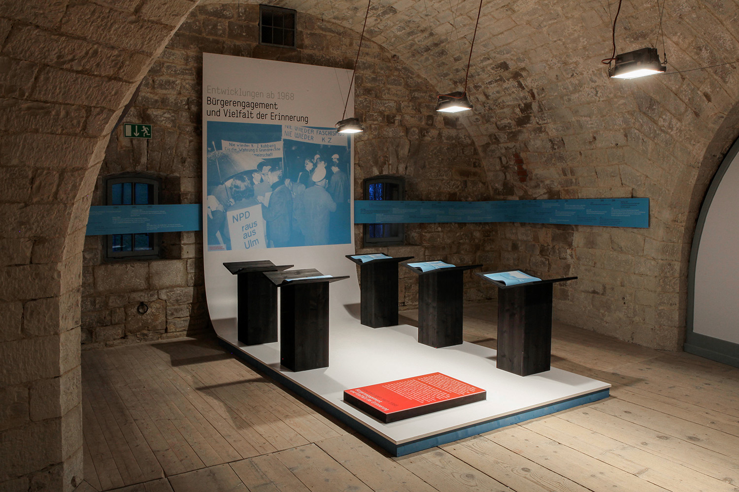 Fünf Stationen zeigen, wie mit den Themen in den verschiedenen zeitlichen Phasen umgegangen wurde. Dazu gehören unter anderem begehbare Rauminstallationen wie der „Schleuse“ zum Ulmer Spruchkammerverfahren oder den „Keilen“ in Holzkuben, die das Durchbrechen des Schweigens der jüngeren Vergangenheit verdeutlichen. Originalexponate, Dokumentreplikate und Quellensammlungen bieten Informationen zum Nachlesen, während eine Audiostation Originalberichte zugänglich macht.
