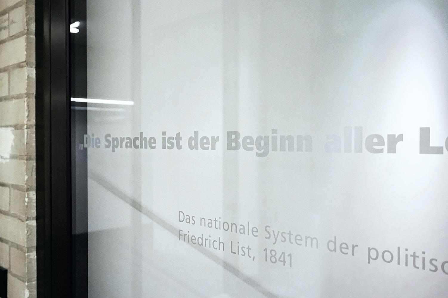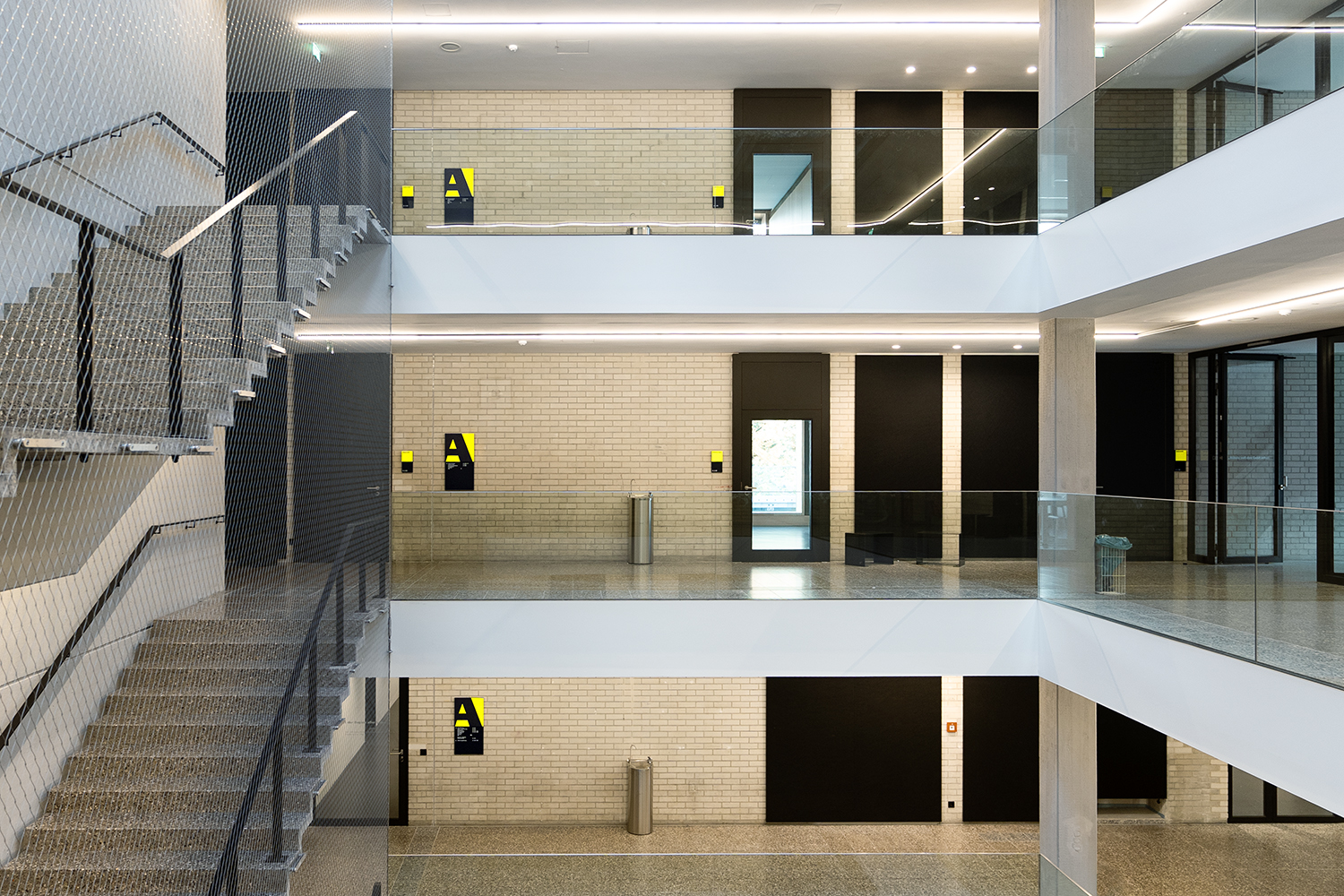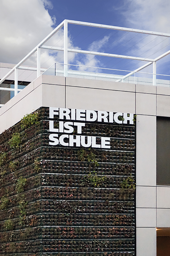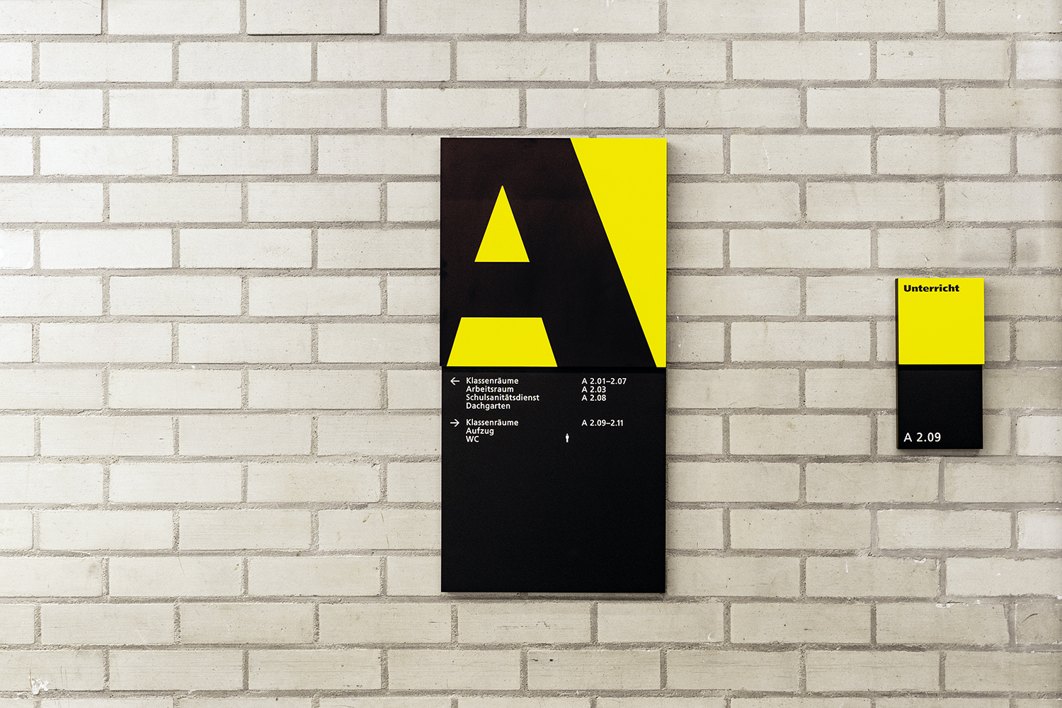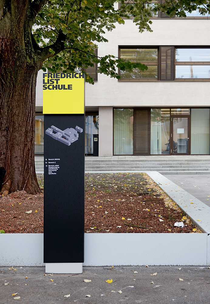 Für die Friedrich-List-Schule wurde die schwarze Grundfarbe der architektonischen Einbauten aufgegriffen, während plakative Buchstaben gestalterisch an die 1970er-Jahre, die Bauzeit der Schule, anknüpfen. Die gelbe Farbfläche setzt gezielt Farbakzente im Innenraum und stärkt die Wiedererkennbarkeit der Signaletik.
