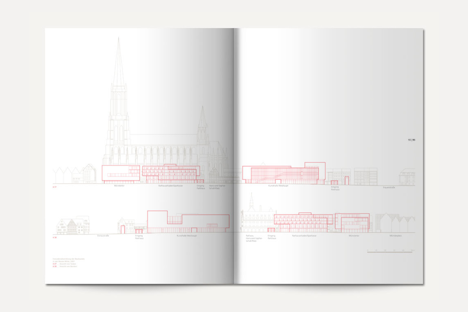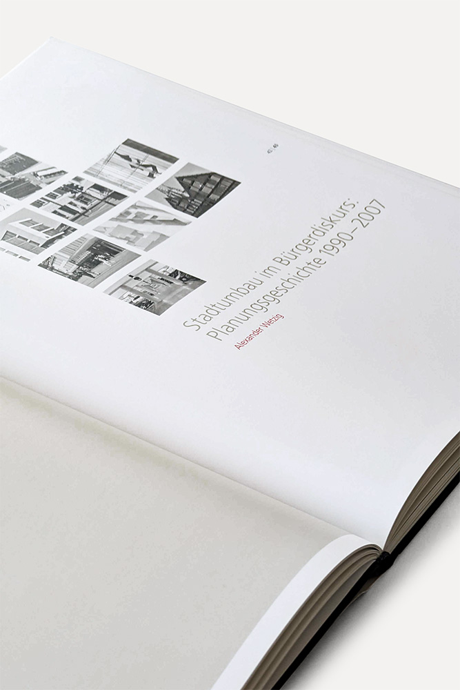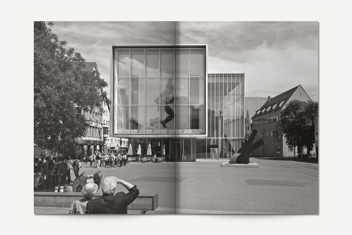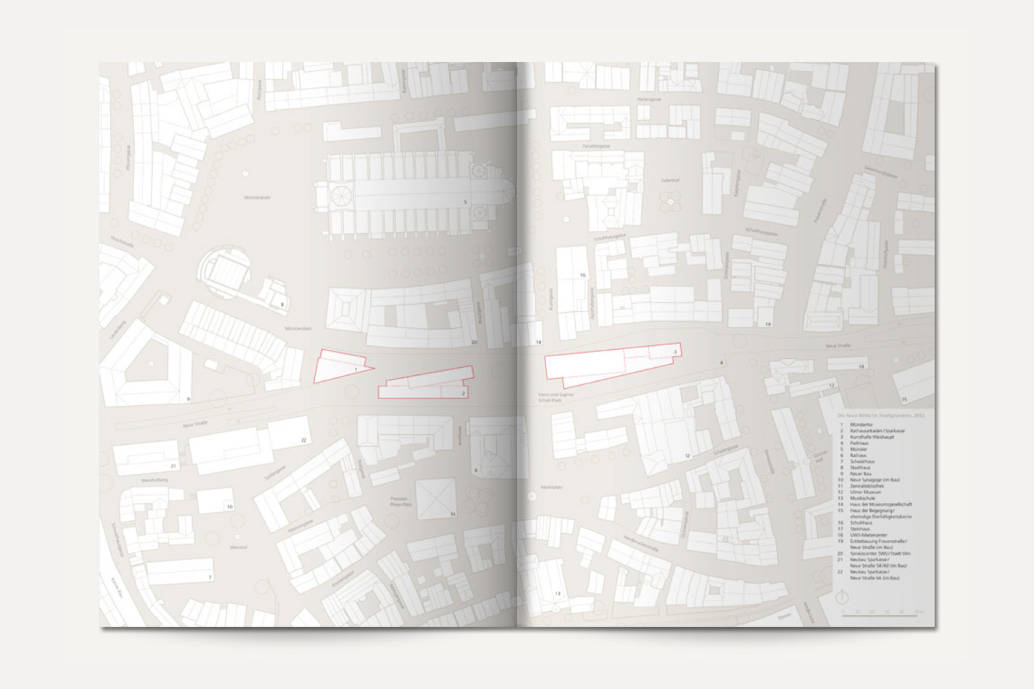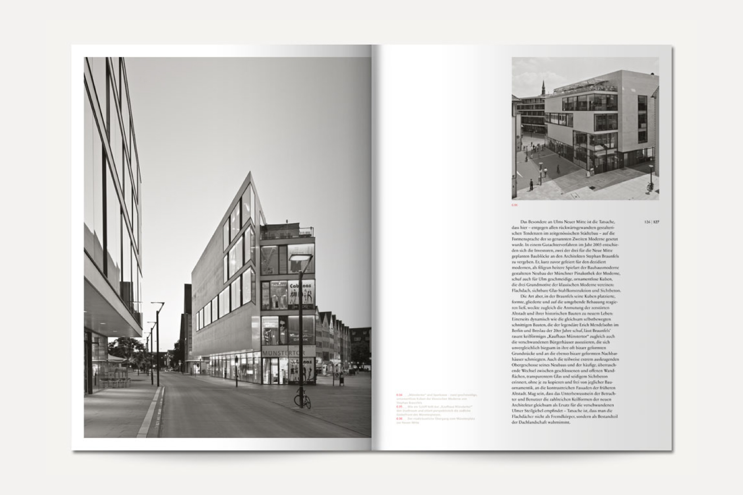 Das Buch beleuchtet die unterschiedlichen Ideen, Themen und Entwicklungsphasen der Neuen Mitte in Ulm im Laufe der Jahre. Die Gestaltung folgt einer klaren Struktur und einer einheitlichen Farbwelt, die nur durch Rot als bewusst gewählte Akzentfarbe aufgebrochen wird.