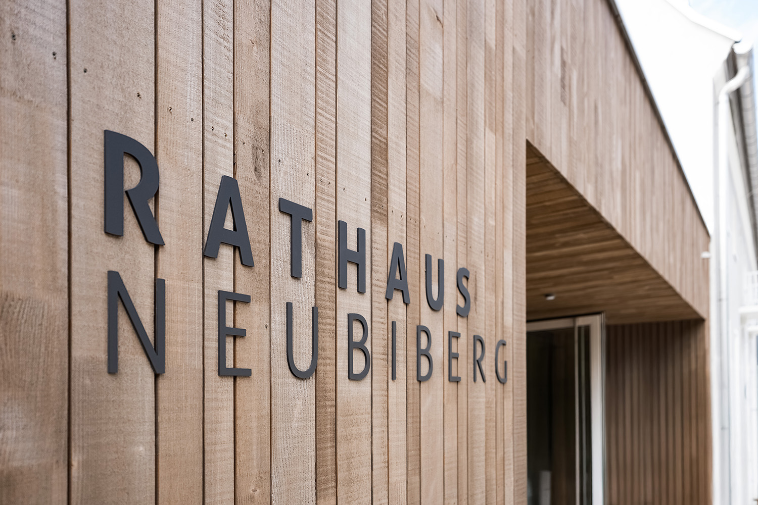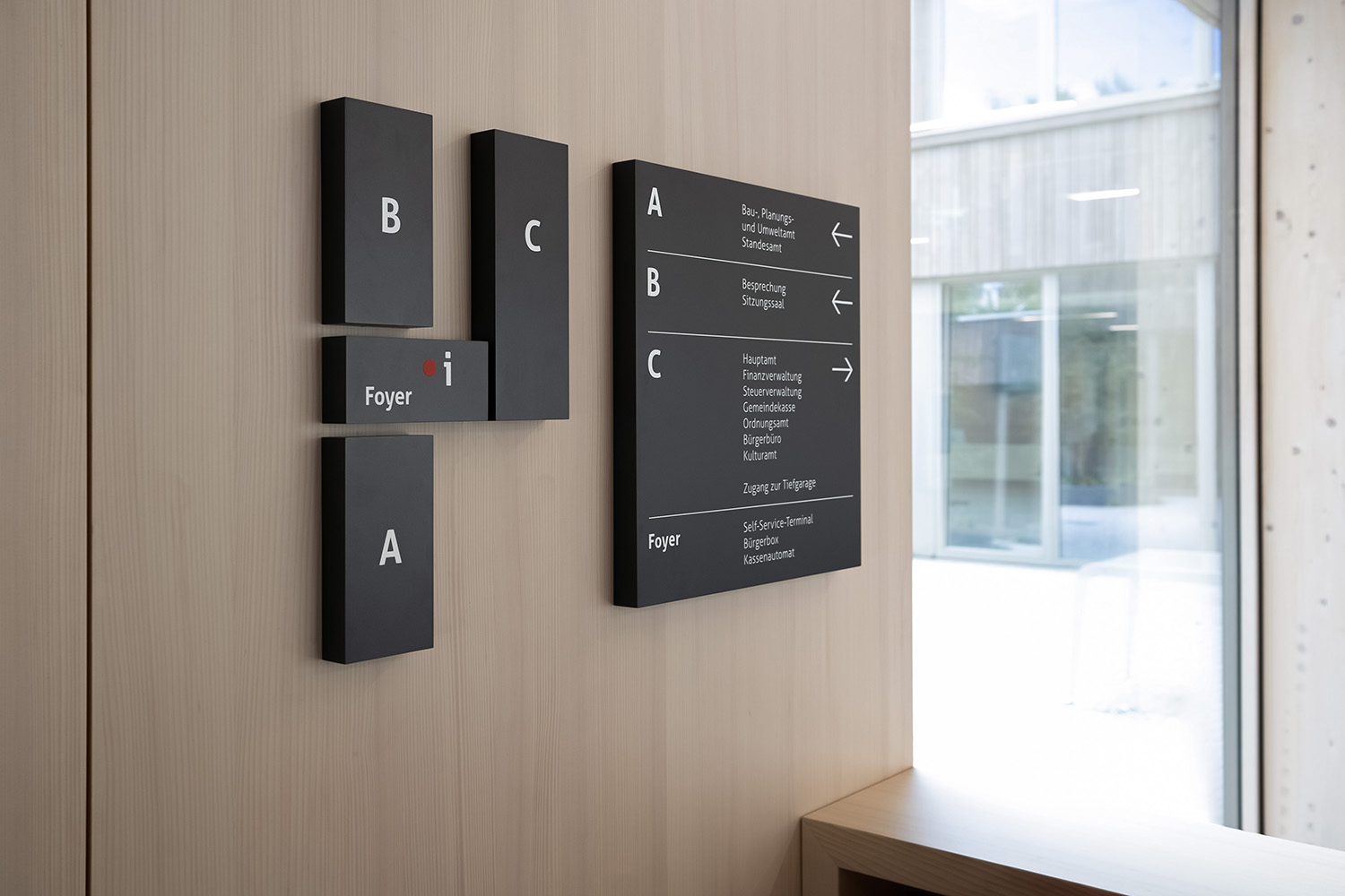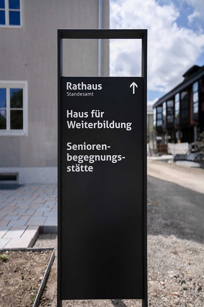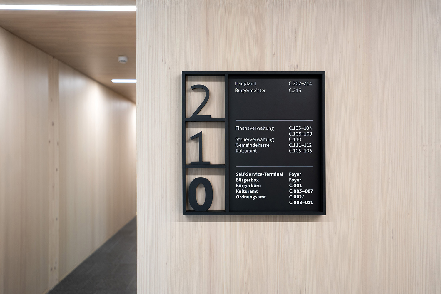 Mit der Sanierung und der Erweiterung des Rathauses Neubiberg wurde ein Orientierungssystem realisiert, das Funktion und Gestaltung in Einklang bringt. Die dunklen, gerahmten Signaletik-Elemente strukturieren das Gebäude. Plakative Ziffern und kontrastreiche Schrift führen die Besucherinnen und Besucher gezielt und ordnen die Ebenen visuell.