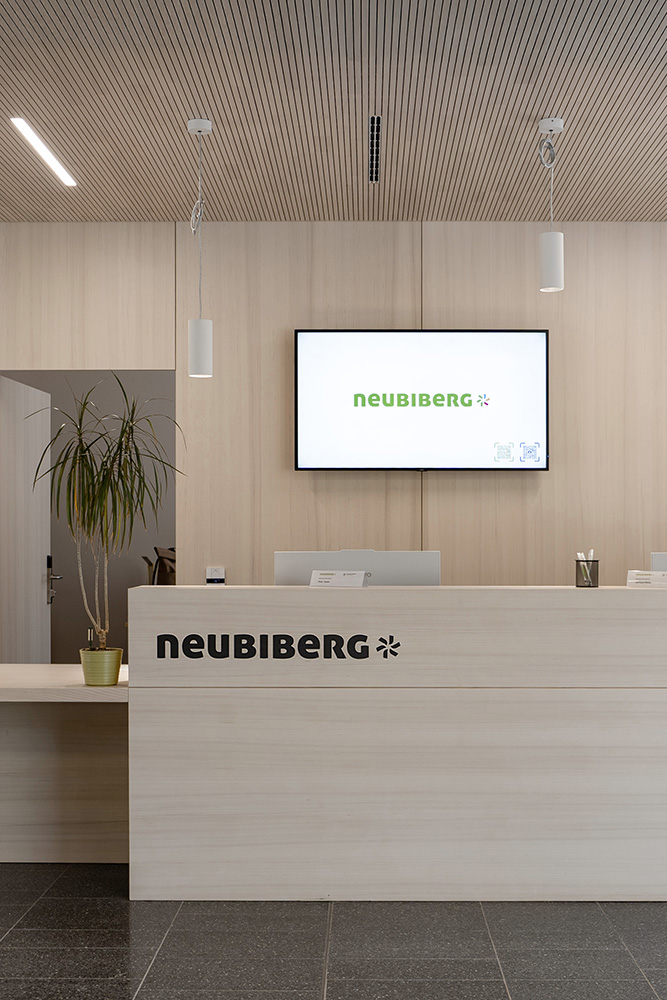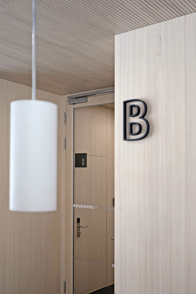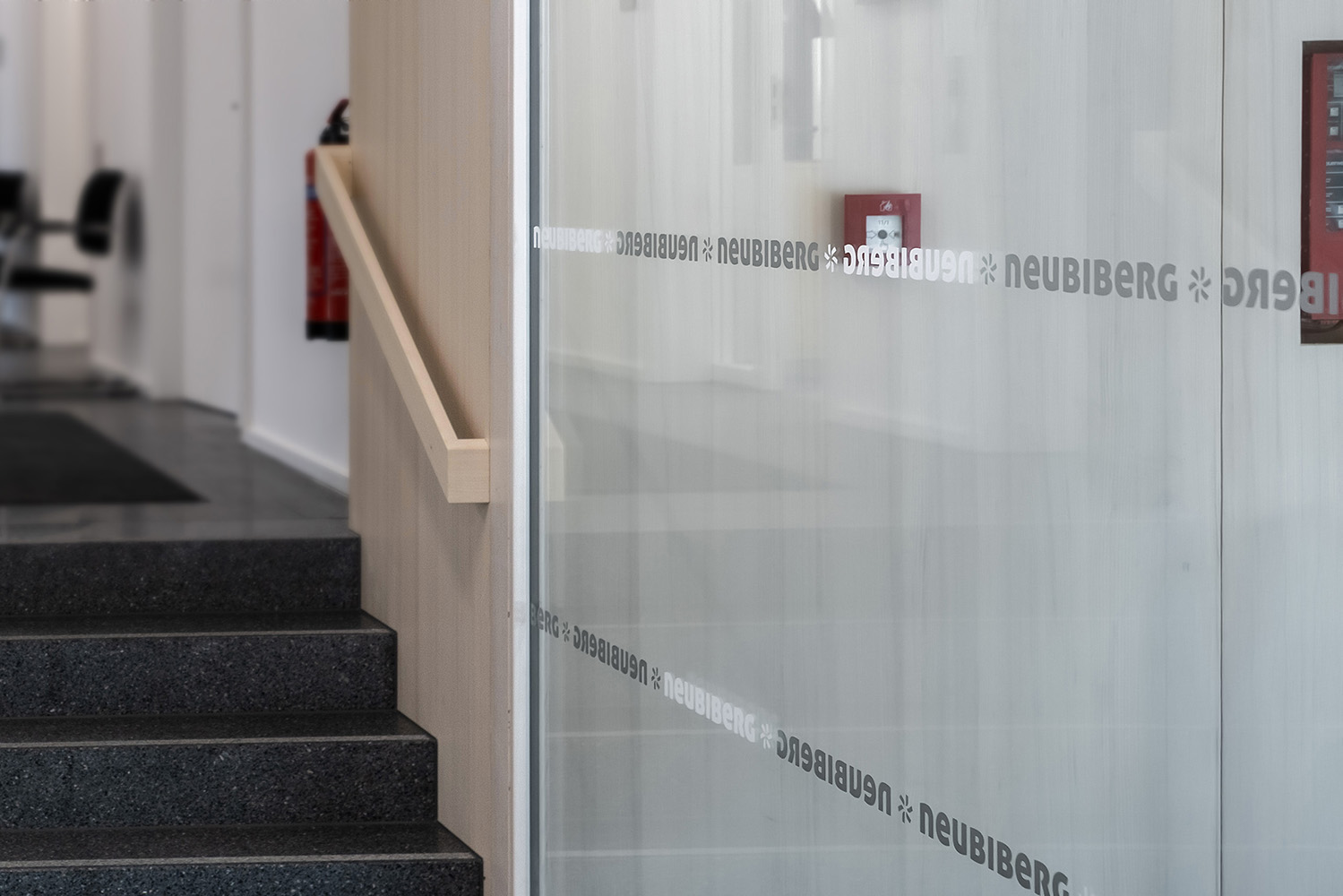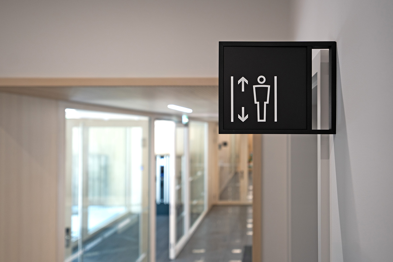 Mit der Sanierung und der Erweiterung des Rathauses Neubiberg wurde ein Orientierungssystem realisiert, das Funktion und Gestaltung in Einklang bringt. Die dunklen, gerahmten Signaletik-Elemente strukturieren das Gebäude. Plakative Ziffern und kontrastreiche Schrift führen die Besucherinnen und Besucher gezielt und ordnen die Ebenen visuell.