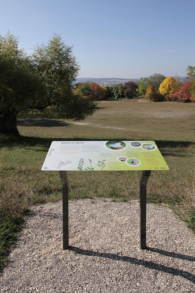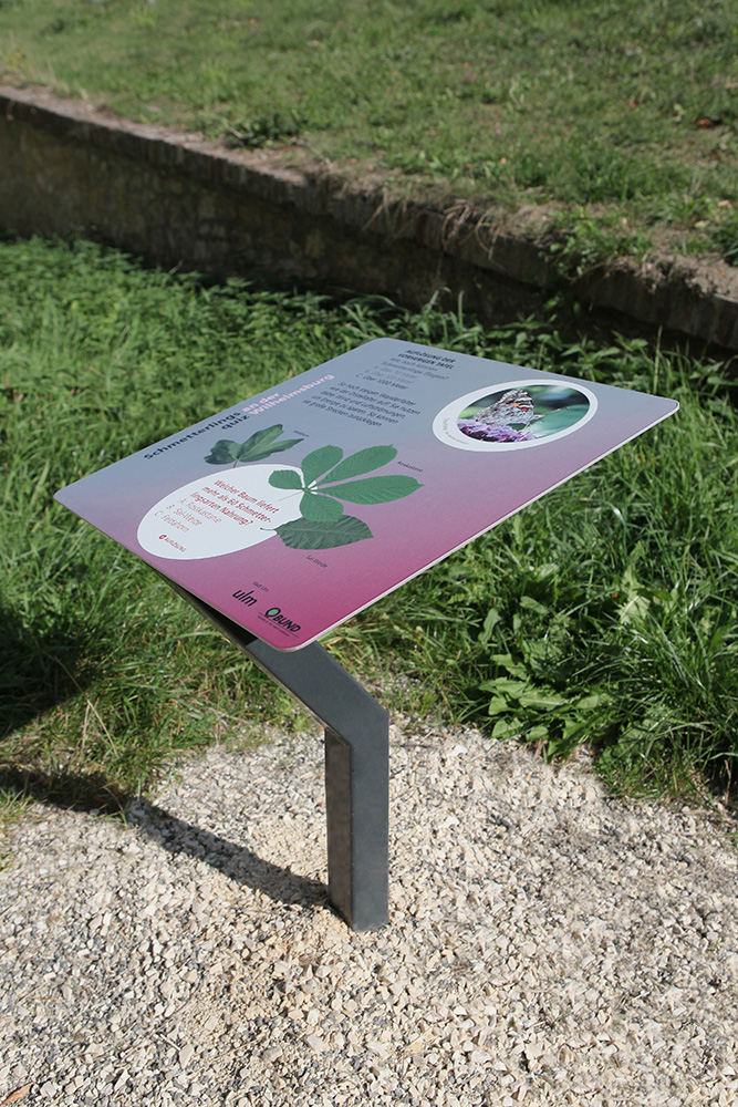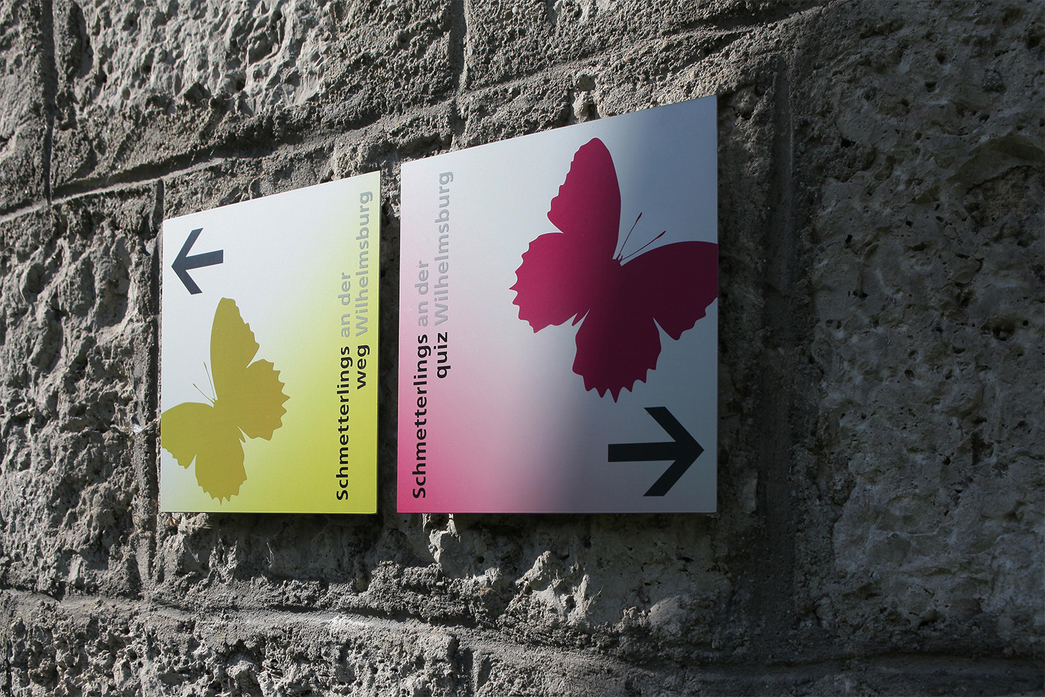 Der Schmetterlingsweg an der Wilhelmsburg erstreckt sich über knapp zwei Kilometer. Er gliedert sich in einen großen und einen kleinen Rundgang. Entlang des Weges vermitteln sieben großformatige Informationstafeln sowie 16 kleinere Quiz-Tafeln Wissenswertes über die Lebensräume und die Lebensweise einheimischer Schmetterlingsarten. Der gelb- und pink-metallisch schimmernde Hintergrund verleiht den Tafeln eine besondere Ausdruckskraft. Je nach Lichteinfall verändert sich der Farbeindruck und erzeugt so ein lebendiges Farbenspiel. Zur Orientierung weisen kleine Tafeln entlang der Stecke den Weg zur nächsten Station.