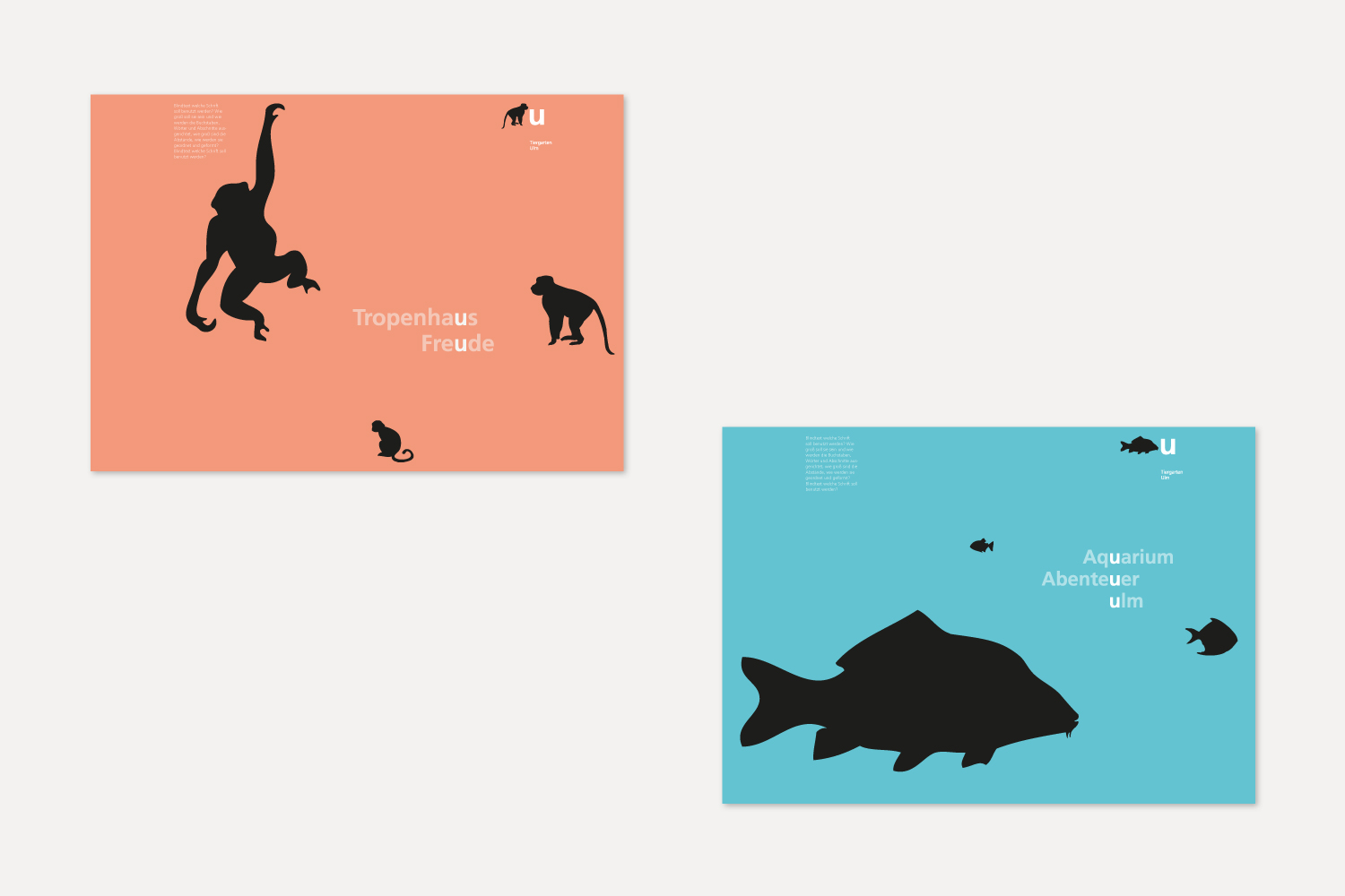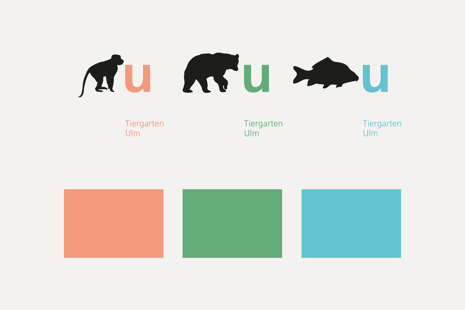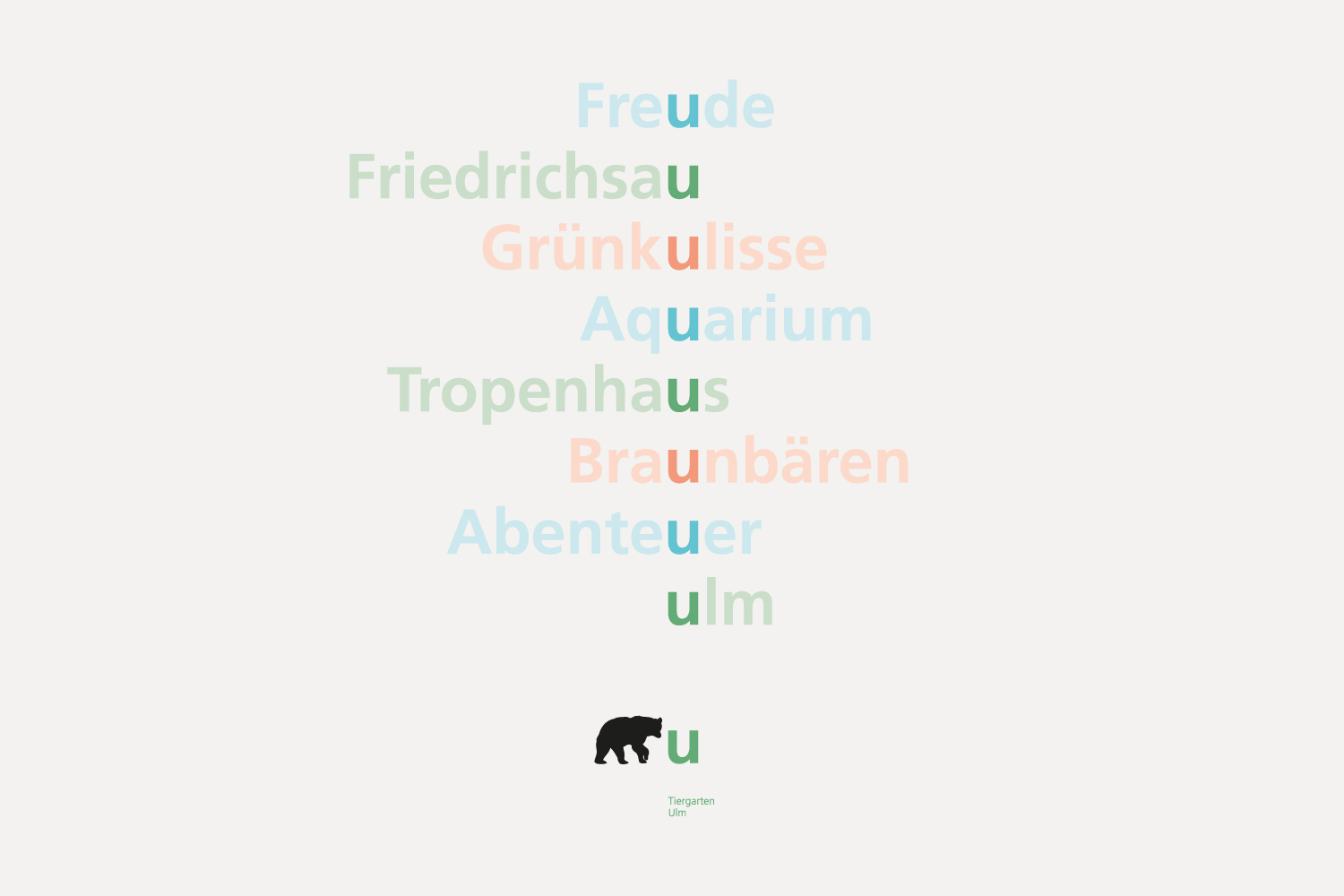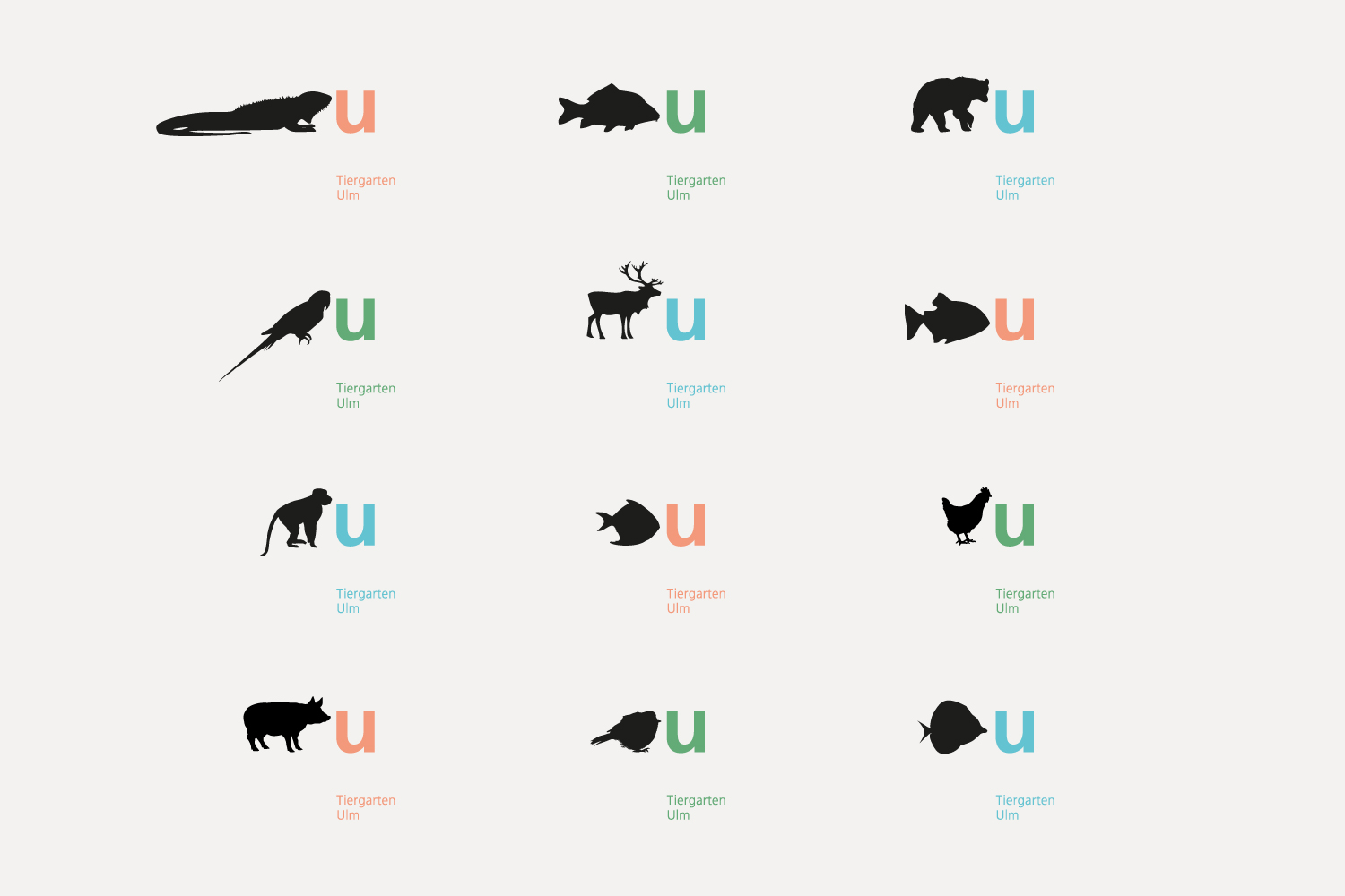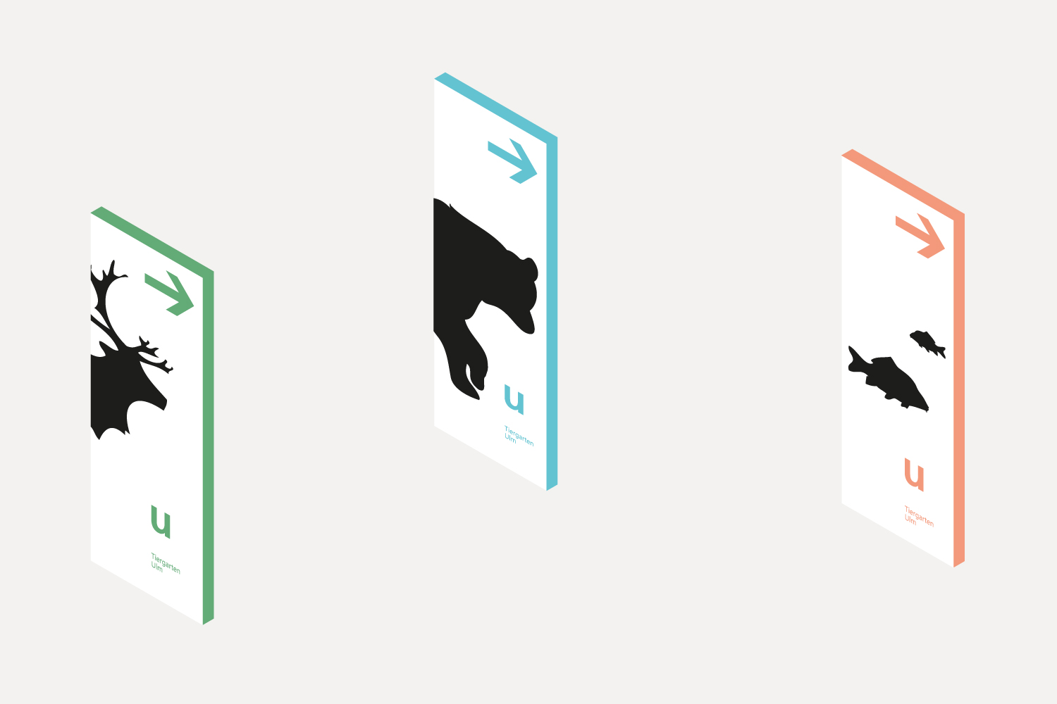 Der Entwurf für das neue visuelle Erscheinungsbild des Tiergartens Ulm entstand im Rahmen eines Wettbewerbs. Das Konzept verbindet Information und Orientierung mit einer klaren, prägnanten und zugleich spielerischen Gestaltung. Verschiedene Tiersilhouetten werden von einem ‚U‘ für Ulm und dem Schriftzug ‚Tiergarten Ulm‘ begleitet. Ein frischer Dreifarbklang sorgt für Wiedererkennung, visuelle Klarheit und einen zeitgemäßen Auftritt.
