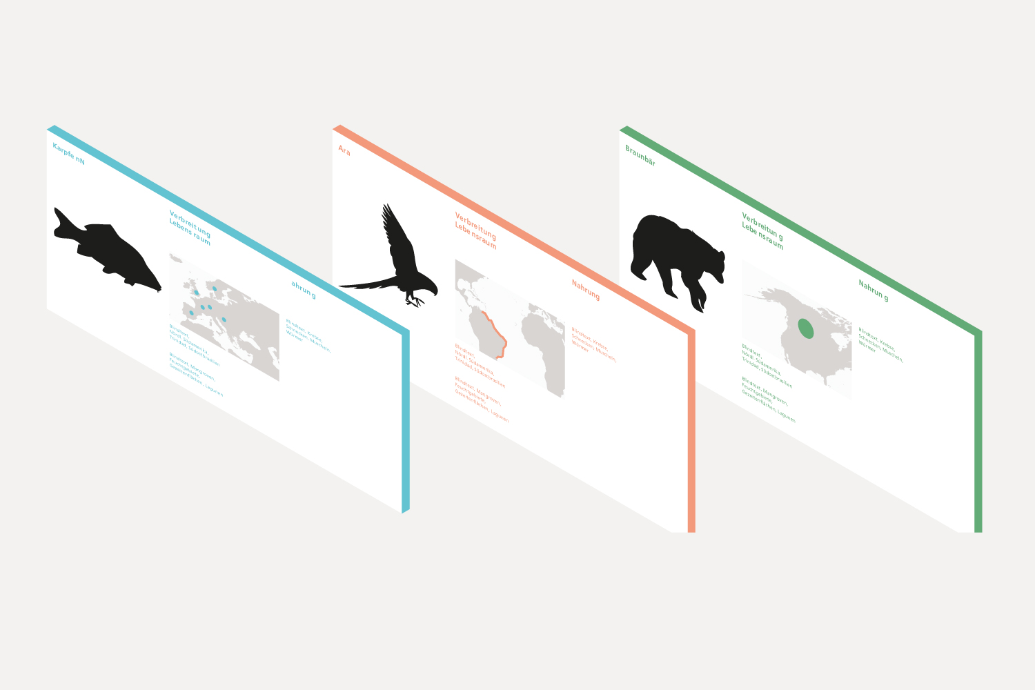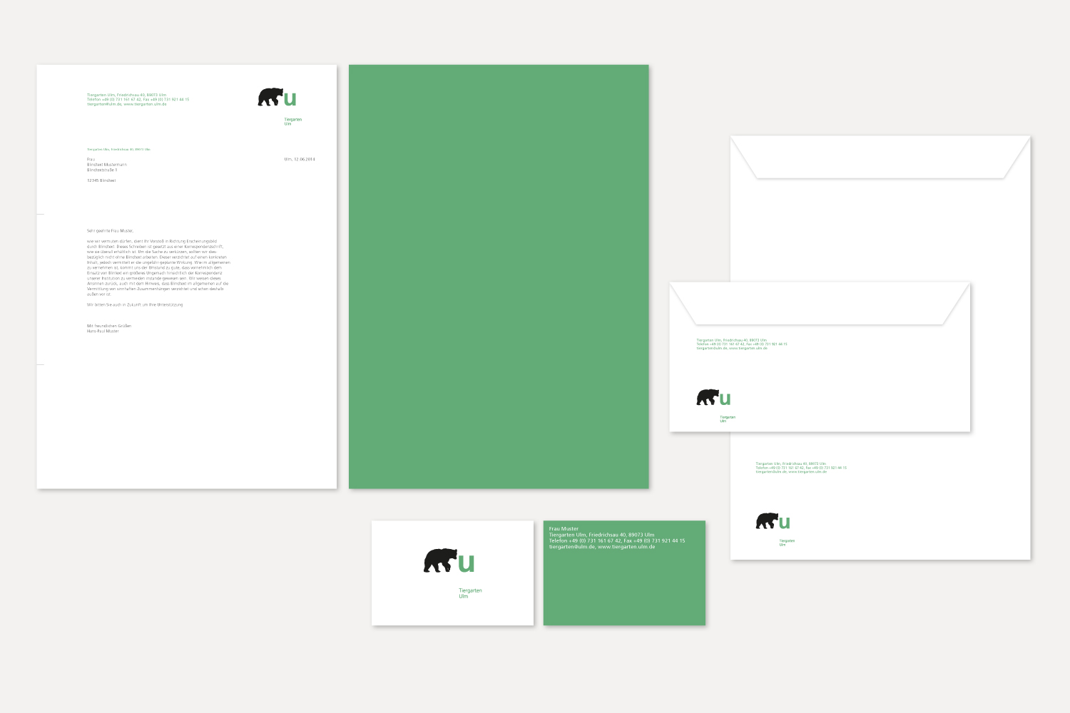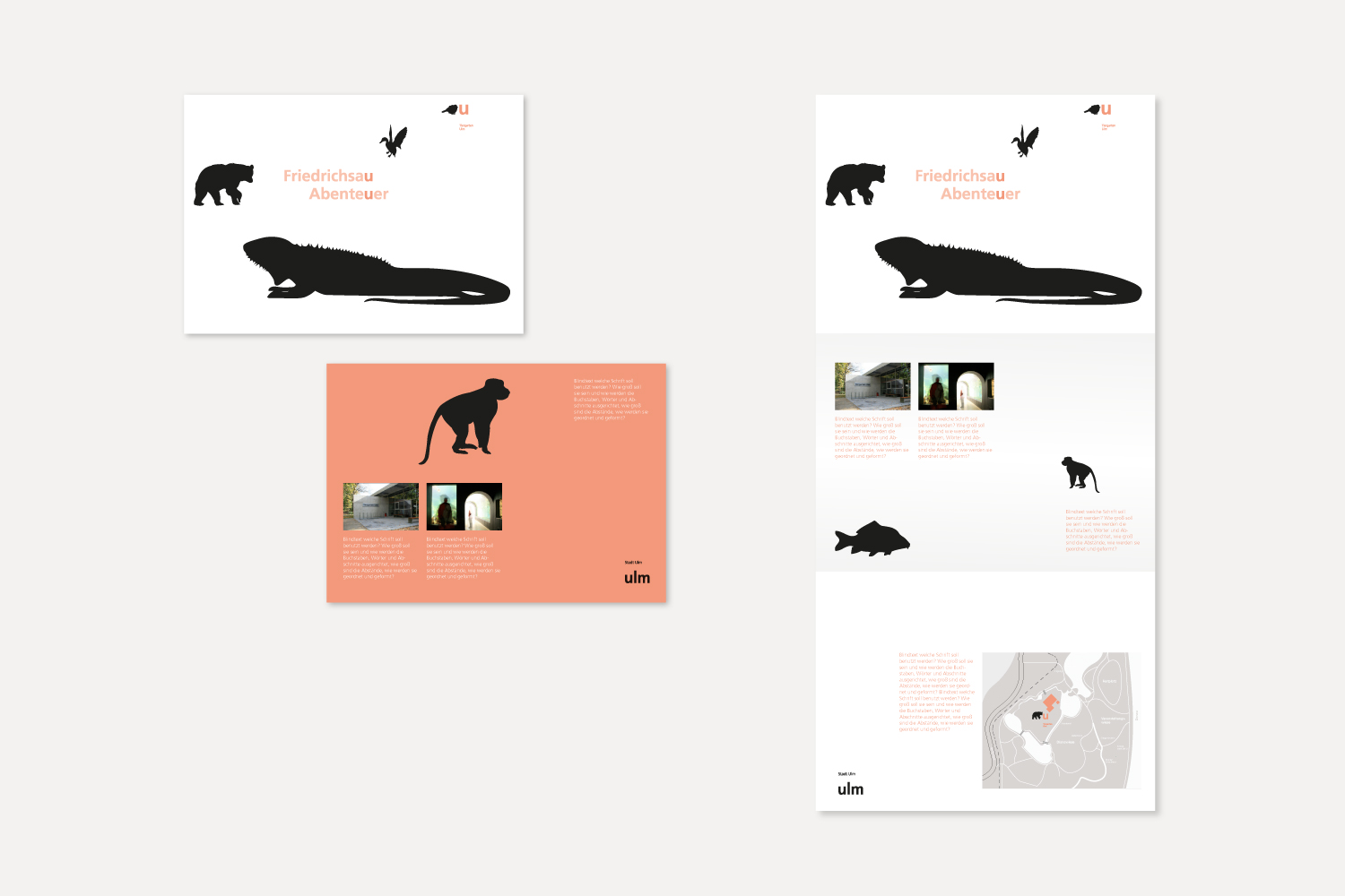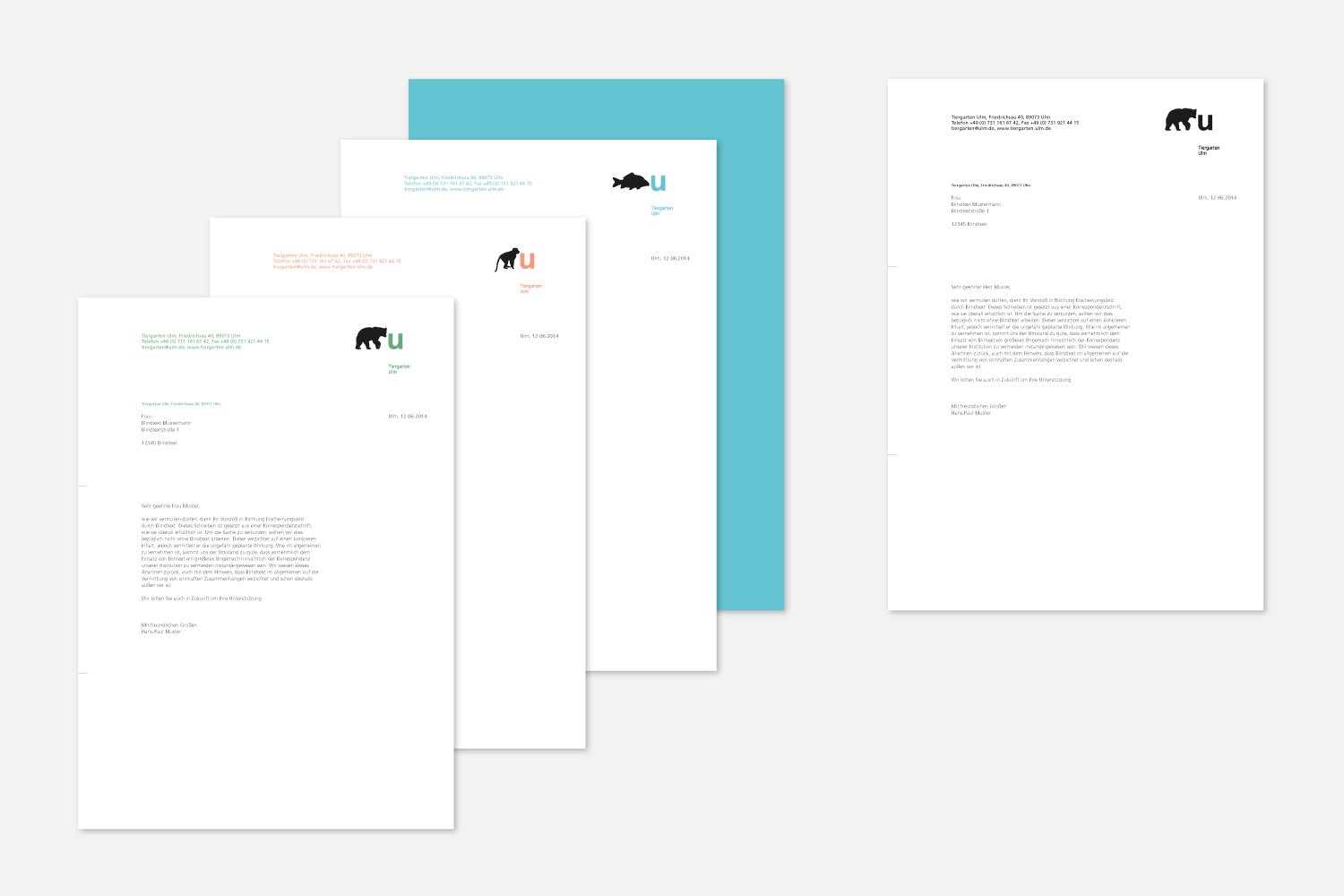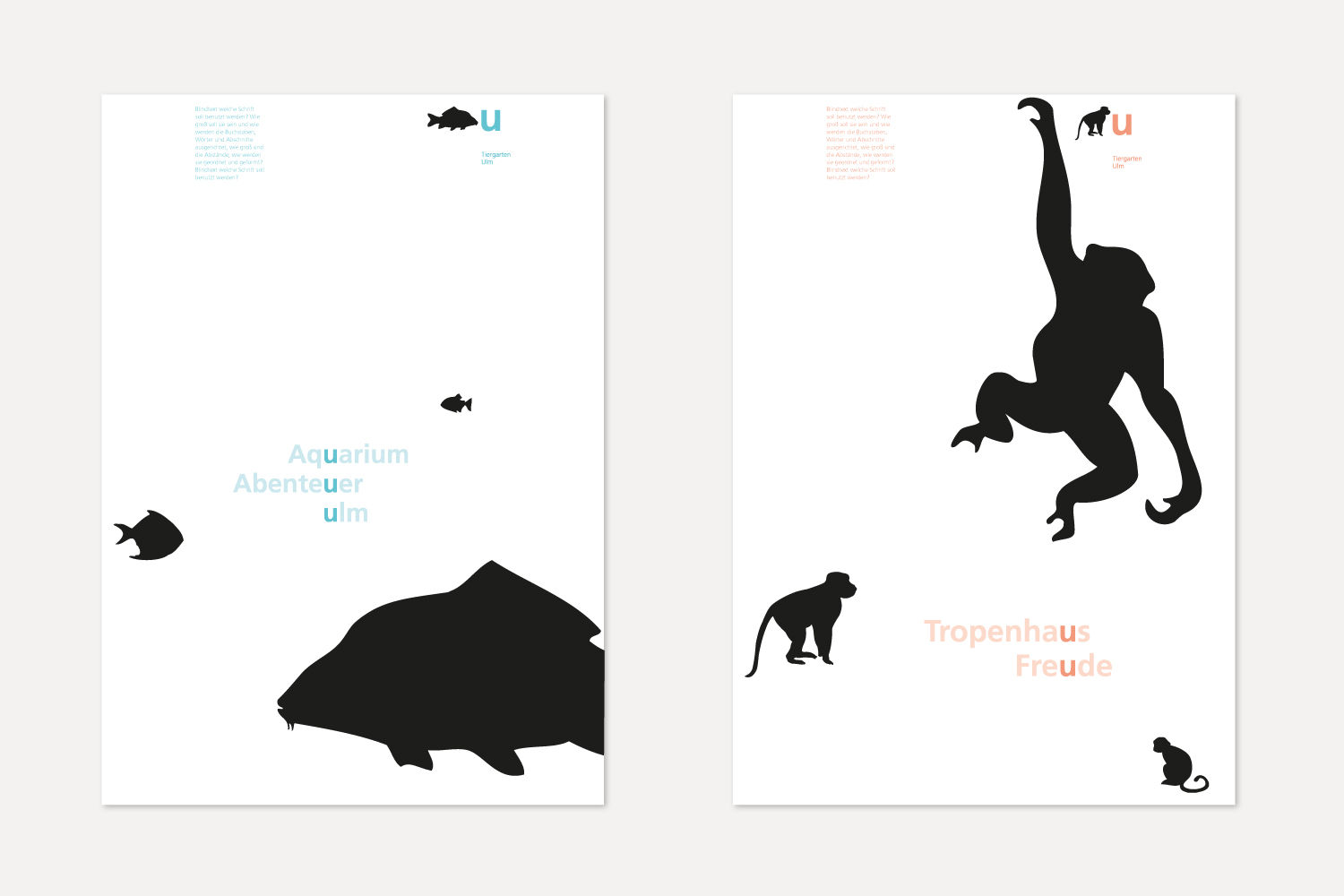 Der Entwurf für das neue visuelle Erscheinungsbild des Tiergartens Ulm entstand im Rahmen eines Wettbewerbs. Das Konzept verbindet Information und Orientierung mit einer klaren, prägnanten und zugleich spielerischen Gestaltung. Verschiedene Tiersilhouetten werden von einem ‚U‘ für Ulm und dem Schriftzug ‚Tiergarten Ulm‘ begleitet. Ein frischer Dreifarbklang sorgt für Wiedererkennung, visuelle Klarheit und einen zeitgemäßen Auftritt.