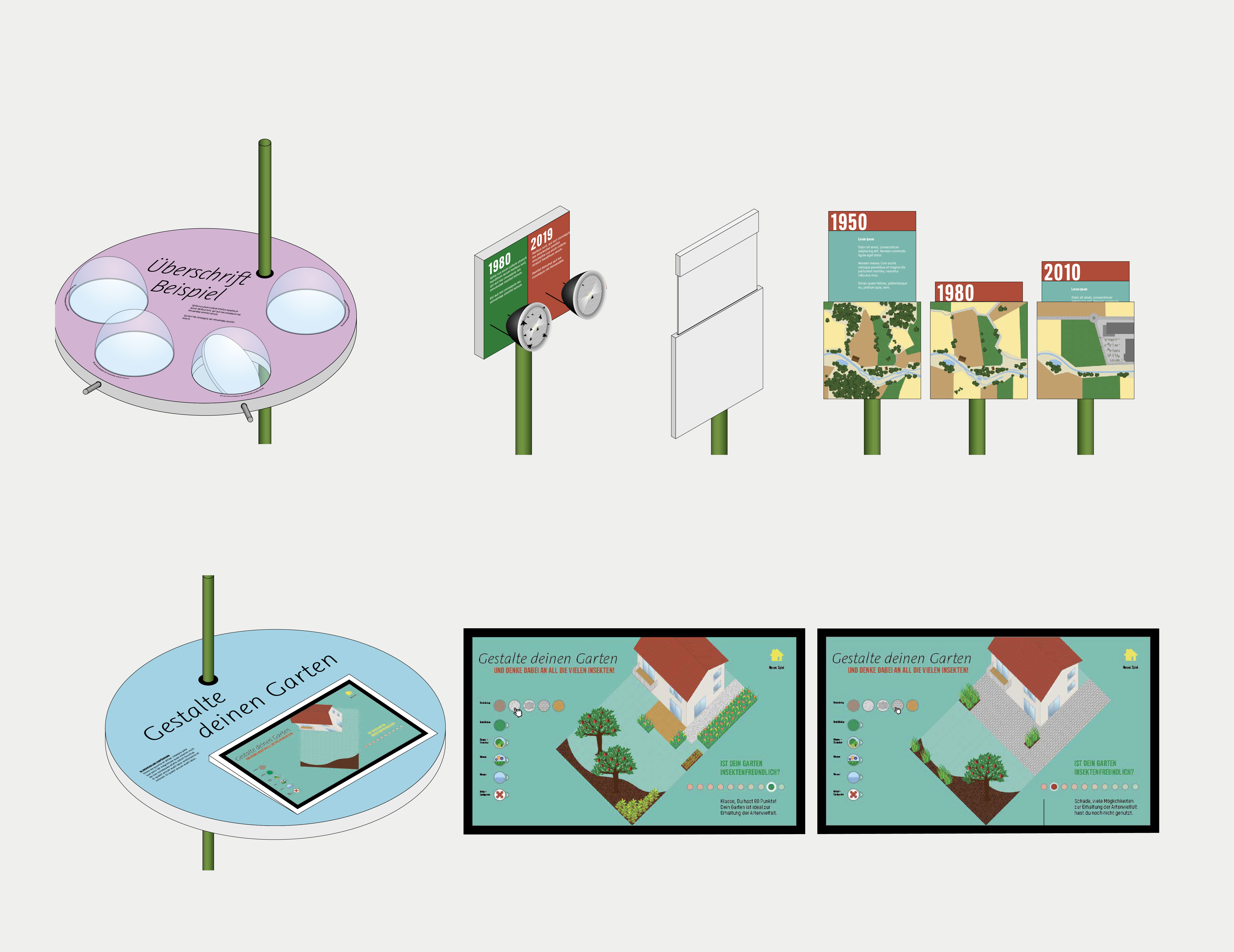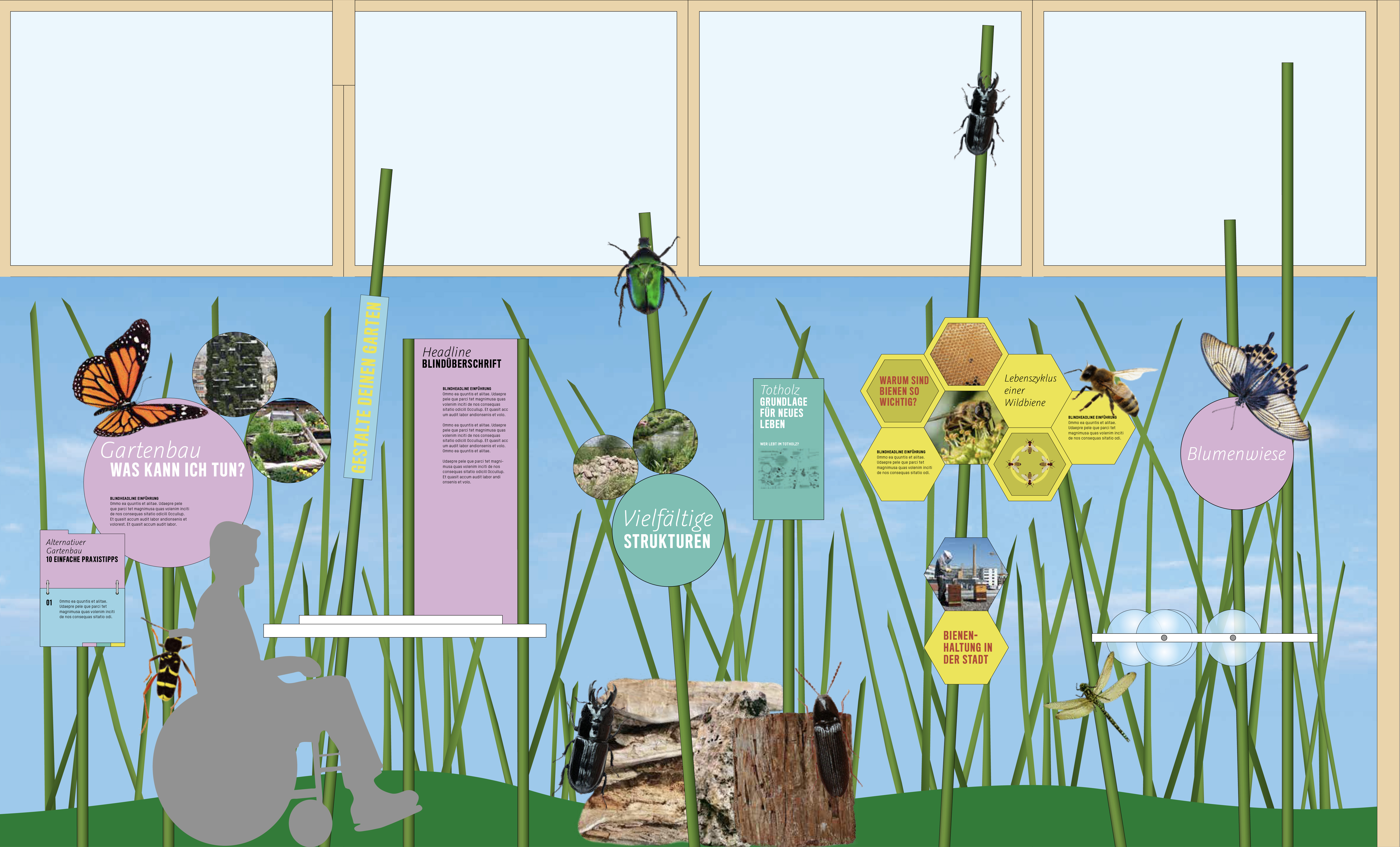 Das Ausstellungskonzept zum Thema Artenvielfalt wurde im Rahmen eines Wettbewerbs entwickelt. Inhalte sollen vorrangig über Stimmungsbilder vermittelt werden. Vertikale Stangenelemente, die an eine überdimensionale Blühwiese erinnern, bilden die visuelle Klammer der Ausstellung und dienen zugleich der Bespielung von Informationen und Didaktikelementen. Das große Eingangselement fängt Besucherinnen und Besucher am Eingang ab, führt mit Schlagworten in die Thematik ein und leitet sie in den Ausstellungsrundgang. Einfache und robuste interaktive Elemente ermöglichen einen niederschwelligen Zugang und werden zum Teil durch digitale Anwendungen ergänzt.