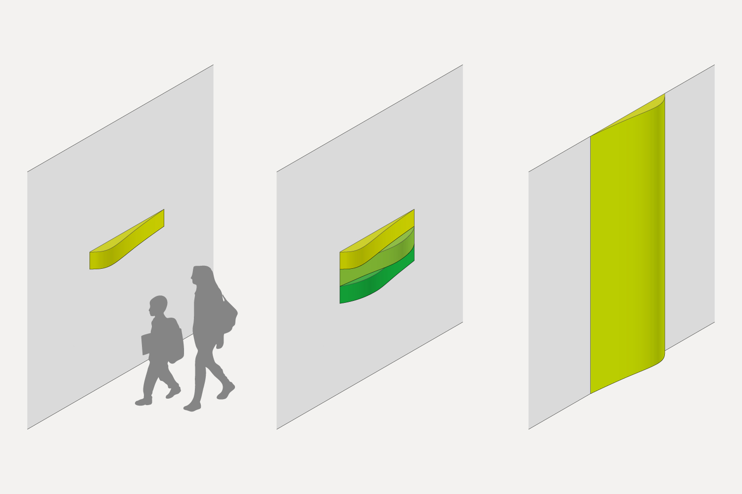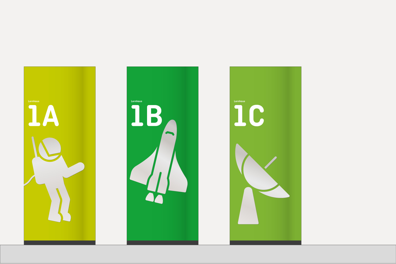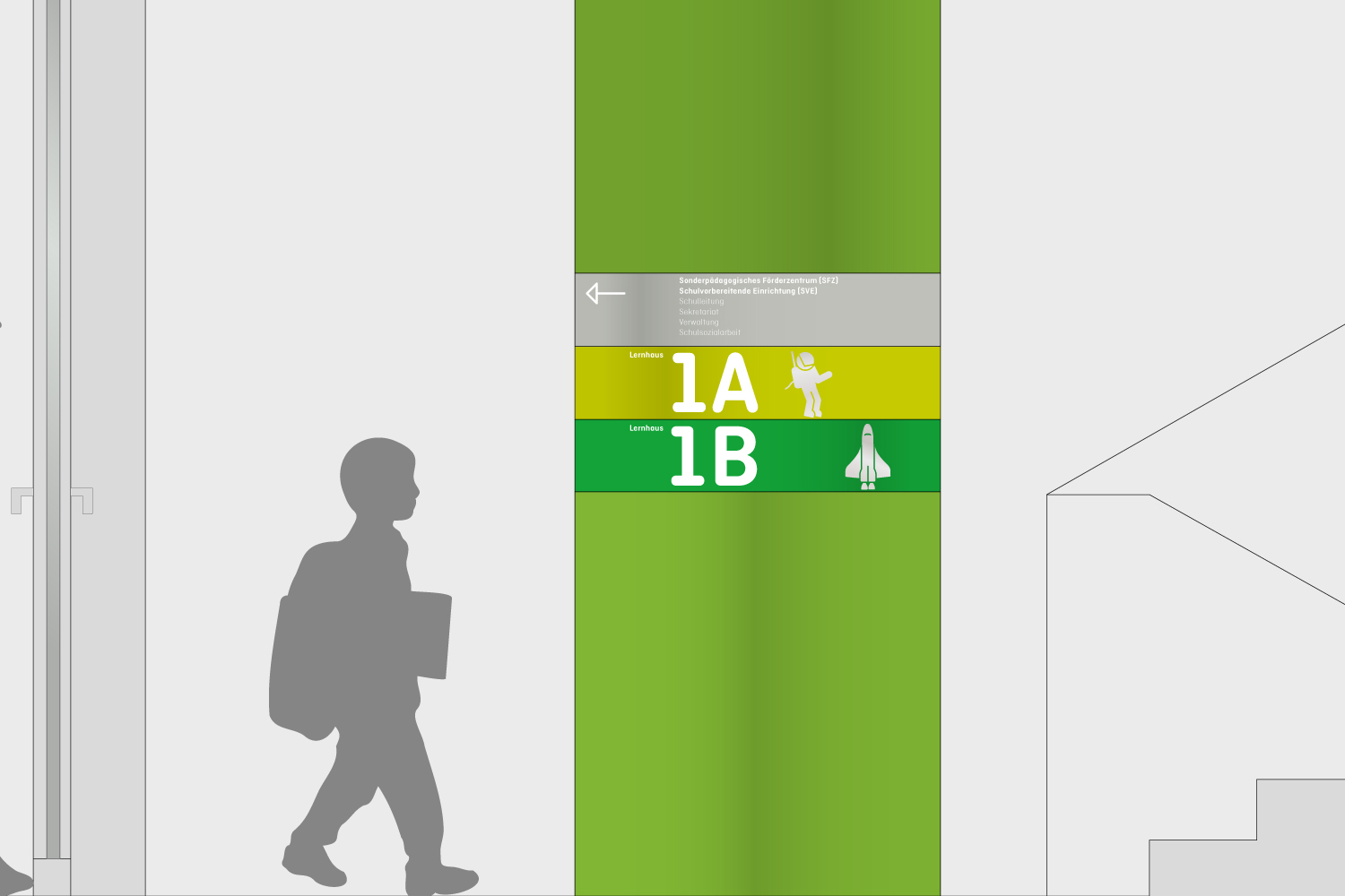 Individuell entwickelte Symbole und Piktogramme verstärken die Identität der einzelnen Lernhäuser. Sie sind prägnant, leicht verständlich und tragen zur Wiedererkennbarkeit bei. Die Orientierung im Raum wird über zwei modulare Elementtypen unterstützt: raumhohe, dreidimensionale Stelen kennzeichnen Ziele, während schmale Module mit variierenden Wölbungen als Richtungsweiser fungieren und flexibel kombinierbar sind.
