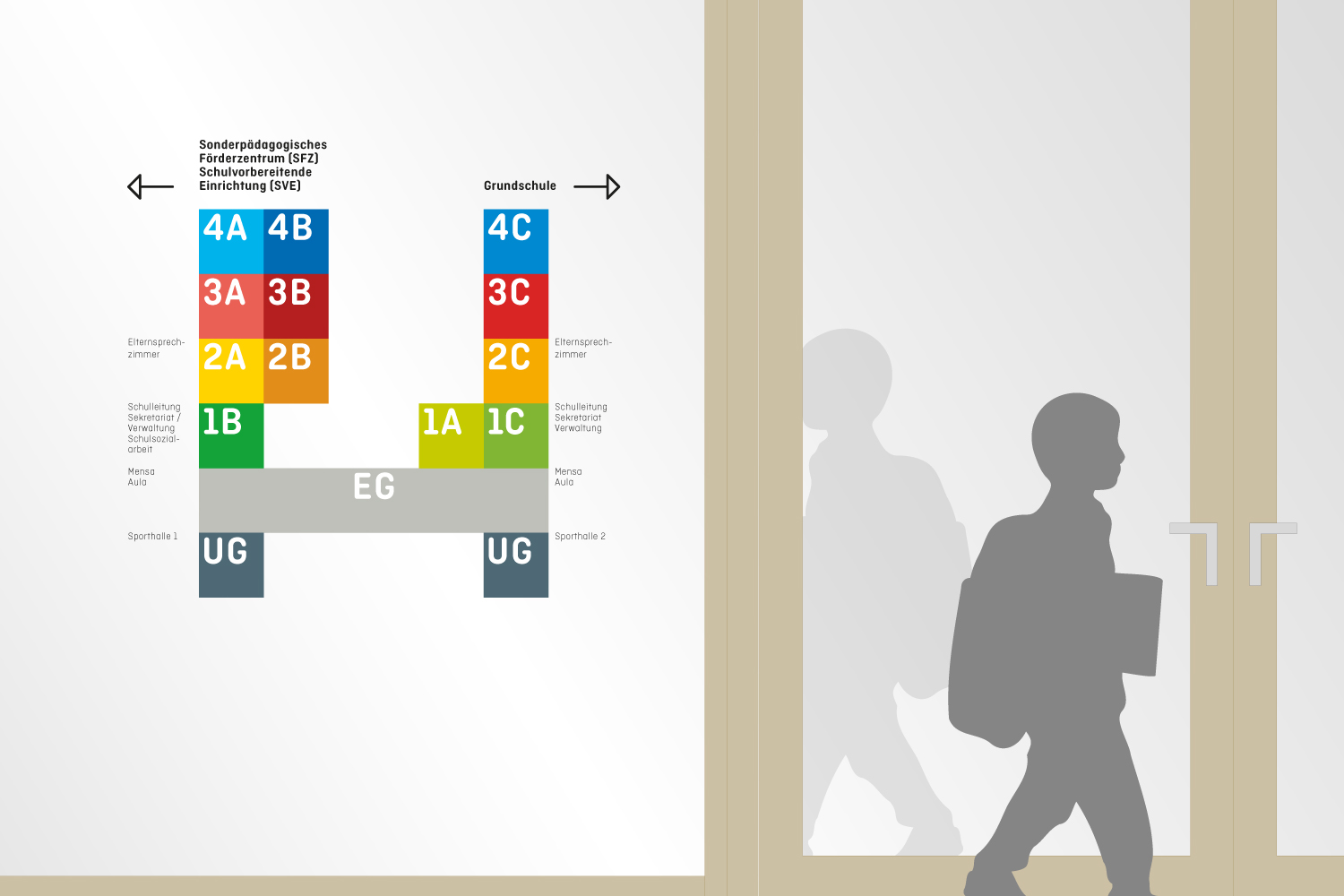 Farbakzente an der Fassade verknüpfen das Leitsystem mit der Architektur des Schulzentrums und machen die Struktur auch von außen sichtbar. So entsteht ein Orientierungssystem, das funktional überzeugt und zugleich gestalterisch die Vielfalt und Eigenständigkeit der Lernhäuser unterstreicht.