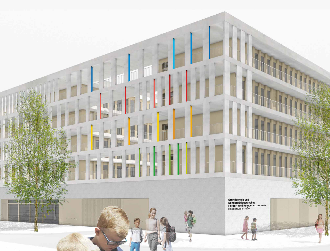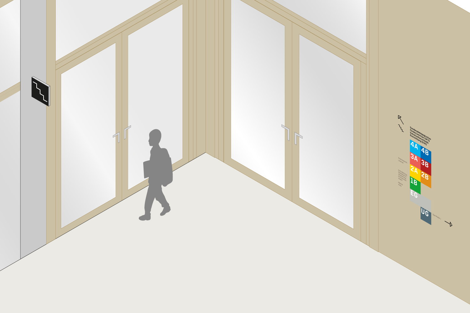 Das Signaletikkonzept für das Schulzentrum mit Grundschule sowie sonderpädagogischem Förder- und Kompetenzzentrum in München schafft klare Orientierung durch ein Zusammenspiel von Farbe, Symbolik und räumlichen Elementen. Jedes Lernhaus ist einer eigenen Farbgruppe zugeordnet, die sich pro Stockwerk in drei Nuancen entfaltet. Fach- und Verwaltungsräume erhalten eigene Farbcodierungen, sodass eine eindeutige Zuordnung und schnelle Erkennbarkeit gewährleistet sind.